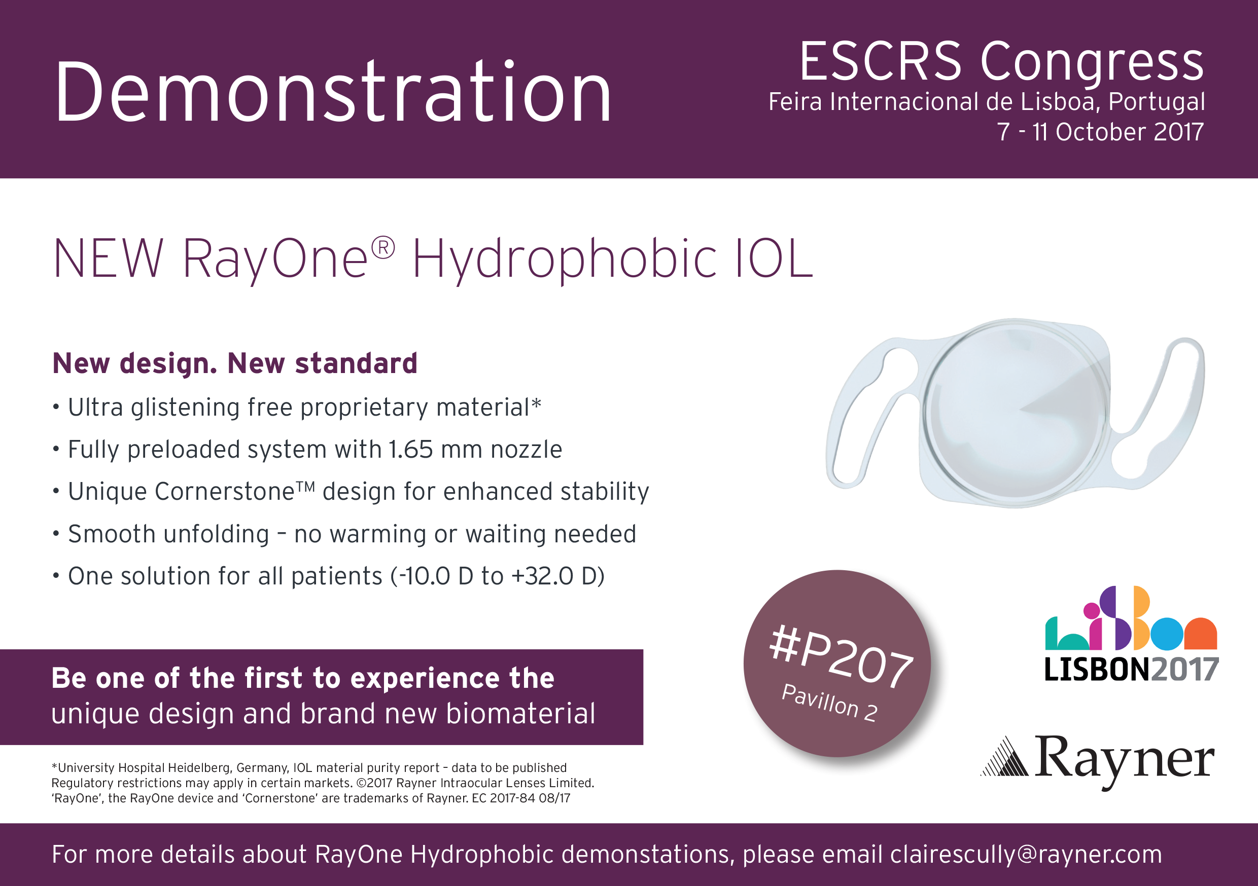 As part of Rayner’s preview at the ESCRS, surgeons can take part in hands-on demonstrations of the RayOne Hydrophobic, showcasing its unique design and brand-new biomaterial, delivered in a market-leading micro-incision injection system. See below for full event details.